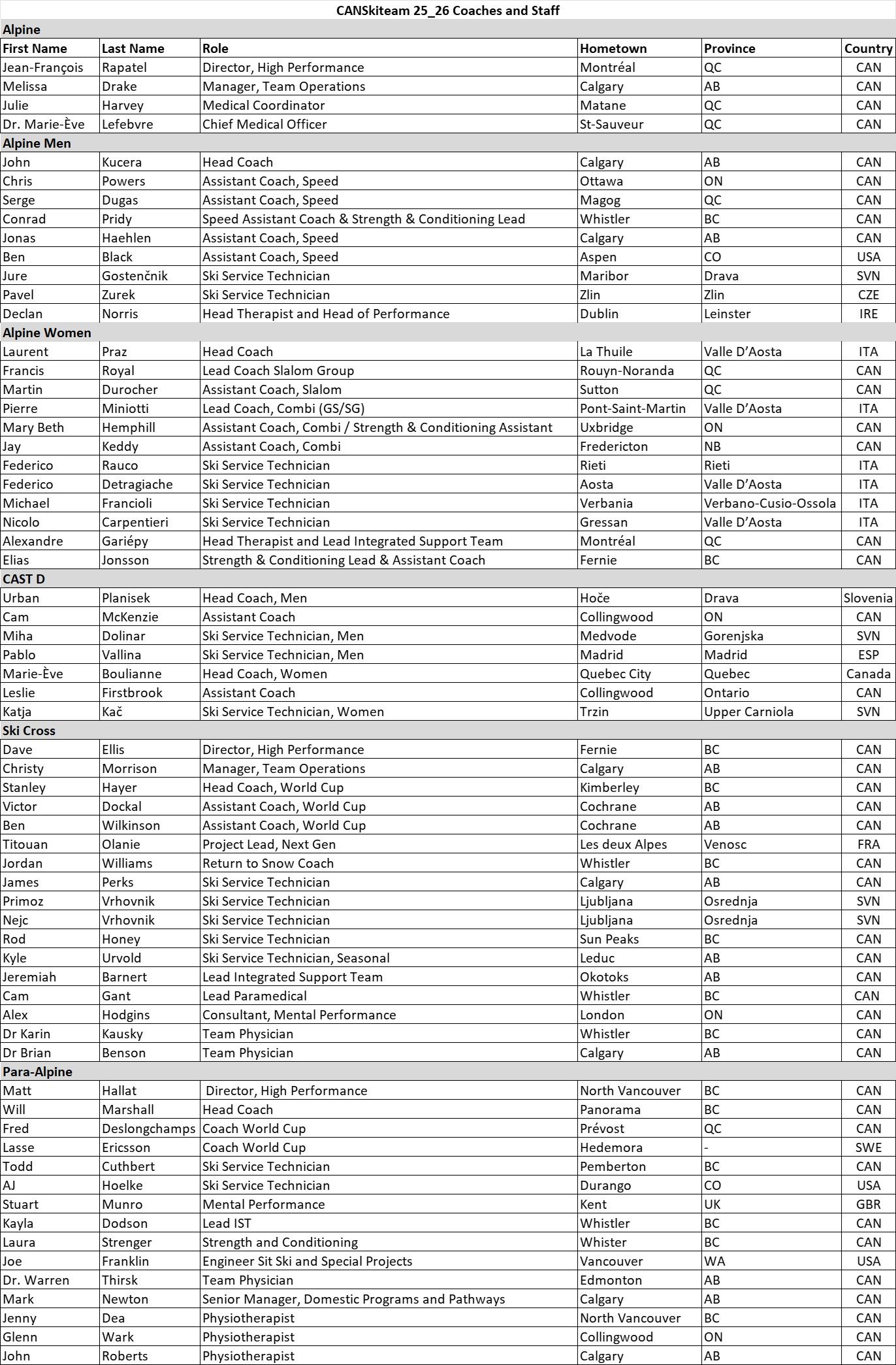 Get in TouchCalgary, Alta. (October 16, 2025) — Alpine Canada today announced the coaches and staff who will be leading and supporting Canada’s National Ski Team for the 25_26 FIS World Cup season, and the 2026 Milano Cortina Olympic Winter Games, across the three disciples of alpine, ski cross and Para alpine. This staff represents some of the top professionals in their respective fields, all committed to best supporting our athletes on and off the snow, and to increasing podium performances for Canada.
